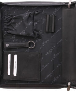 Tablet bzw. iPad Pro Tasche mit 2 Handgriffen und 1 Vordertasche. Multifunktions-Fächer für u.a. Handy, Visitenkarten, USB-Stick, Stifte und ein Schlüsselbund. Futter in schwarz mit Logo. Hergestellt in Indien.